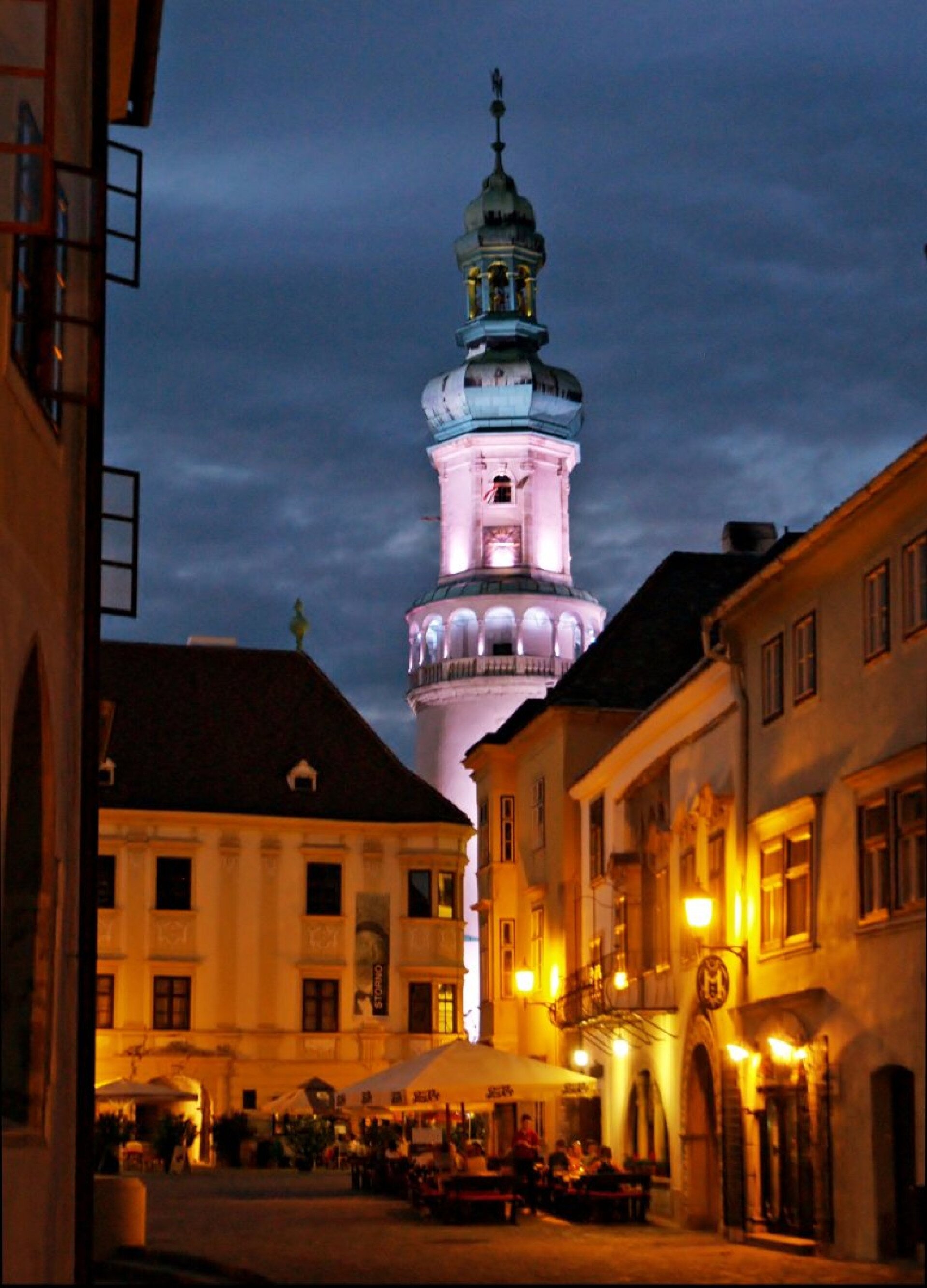 The Fire Tower is a symbol of the town of Sopron. It has Roman foundations, its cylindrical part is medieval, its balcony and clock tower are Renaissance, its dome is Baroque. Its Loyalty Gate frames the 2,000-year history of the town centre.