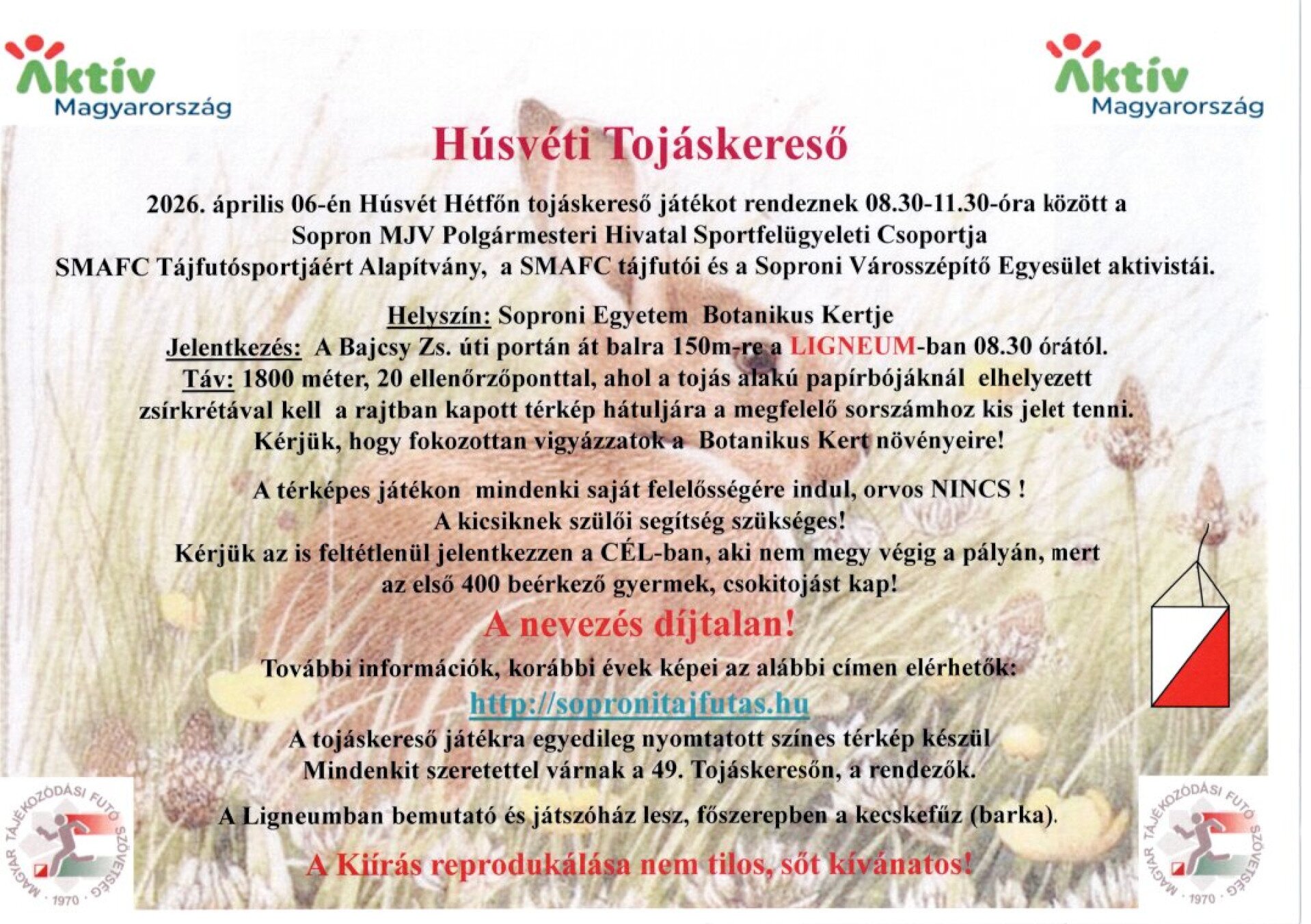 Várjuk húsvéthétfőn a családokat a Botanikus kertbe, ahol egy 20 pontot tartalmazó pályát lehet teljesíteni egy térkép segítségével. A részvétel ingyenes, az első 400 beérkező gyermek csokitojást kap ajándékba.