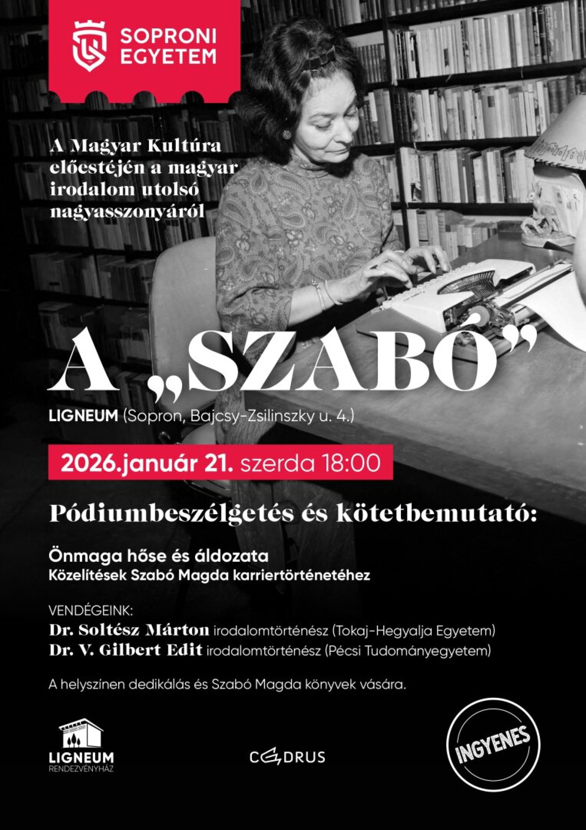 A Ligneum Rendezvényház a Magyar Kultúra Napja előestéjén két olyan irodalomtörténészt hívott meg, akik Szabó Magda énképének alakulásával foglalkoznak. V. Gilbert Edit a pécsi egyetem jeles oktatója, a soproni nagyszülőkkel büszkélkedő Soltész Márton pedig a sárospataki egyetem kutatója, akinek legújabb tanulmánykötete adja a soproni est témáját: egy nehezített kortárs közegben hogyan lett egy fiatal költőnőből irodalmi nagyasszony?