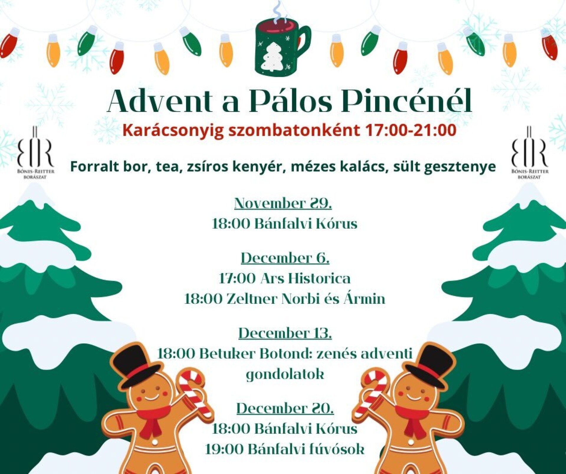 Családias környezetben finom borokkal, hangulatos előadásokkal várunk idén is karácsonyig minden szombaton 17:00-21:00-ig! Forralt bor, tea, zsíros kenyér, mézeskalács, meghitt hangulat.