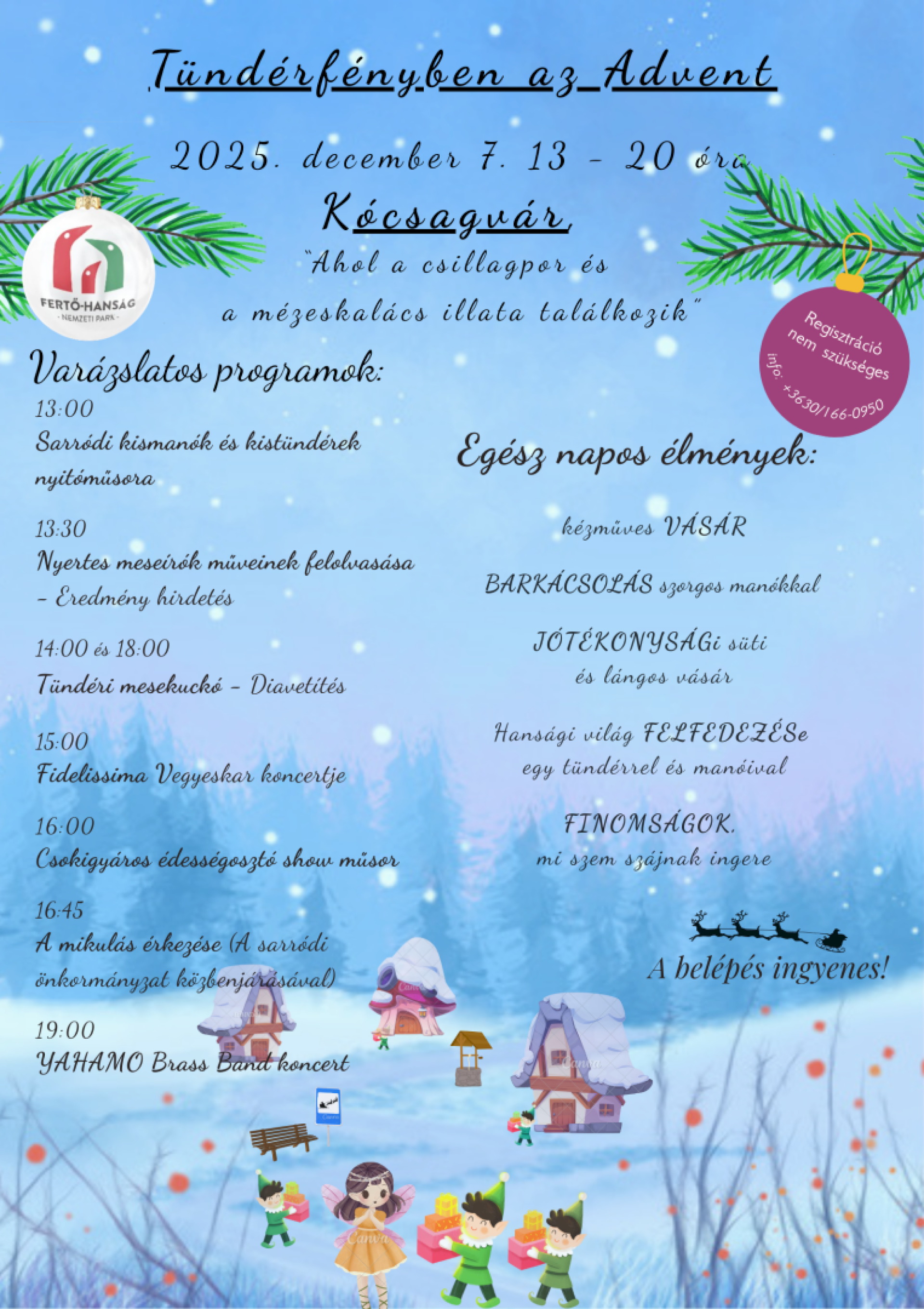 A rendezvény egész ideje alatt kézműves manók szorgoskodnak az ügyeskedni vágyó gyerekekkel és felnőttekkel, kincses árudák kínálják különleges portékáikat. Beléphetünk a Hanság világába egy hanyi tündérrel és manóival, ahol felfedezzük az ott rejlő titkokat, a jótékonysági sütivásár bevételével pedig a sarródi óvoda kismanóit támogathatjuk.