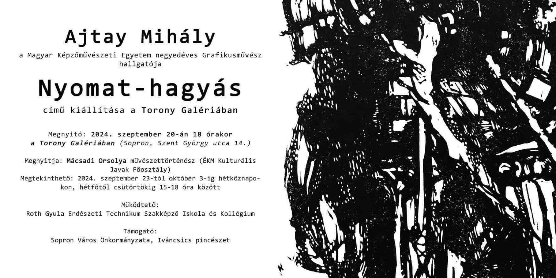 Megnyitó: 2024. szeptember 20-án 18 órakor a Torony Galériában (Sopron, Szent György u. 14)