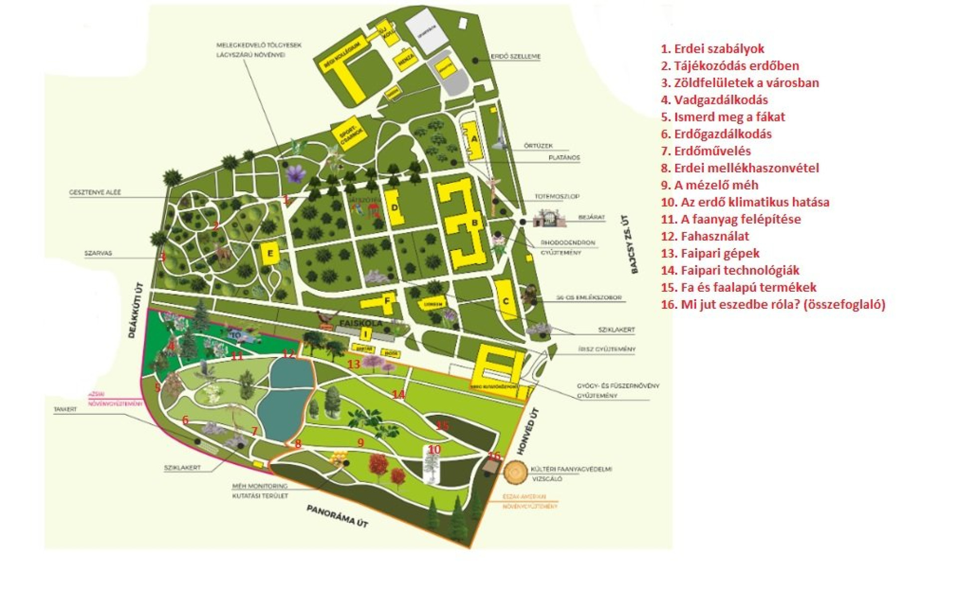 2021-ben egy kétoldalú szlovák-magyar Interreg pályázat keretén belül egy 16 táblából álló tanösvényt alakítottak ki a Botanikus kertben, melyek az egyetem erdészeti és faipari szakjainak legfontosabb tematikáit járják körbe könnyen érthető és élvezhető nyelvezettel megfogalmazva.