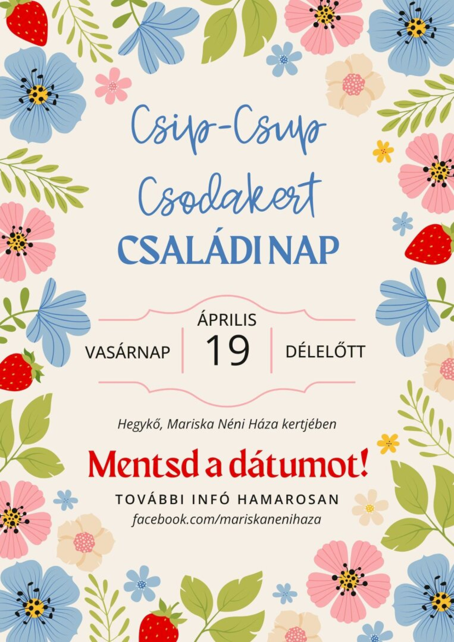 Szeretettel és nagy örömmel hívlak Benneteket a Csip-Csup Csodakert – Családi Napra, amelyet 2026. április 19-én rendezünk meg Hegykőn, a Mariska Néni Háza – Turisztikai Információs Pont mögötti kis kertben.