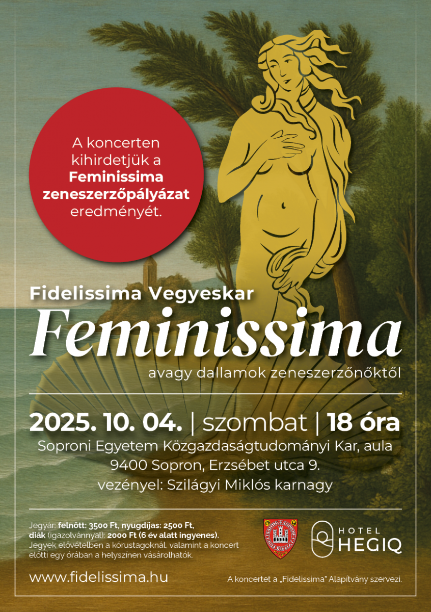 A koncerten kihirdetjük a FEMINISSIMA zeneszerzőpályázat eredményét. Jegyek elővételben a kórustagoknál, valamint a koncert előtti egy órában a helyszínen vásárolhatók. Részletek a plakáton: