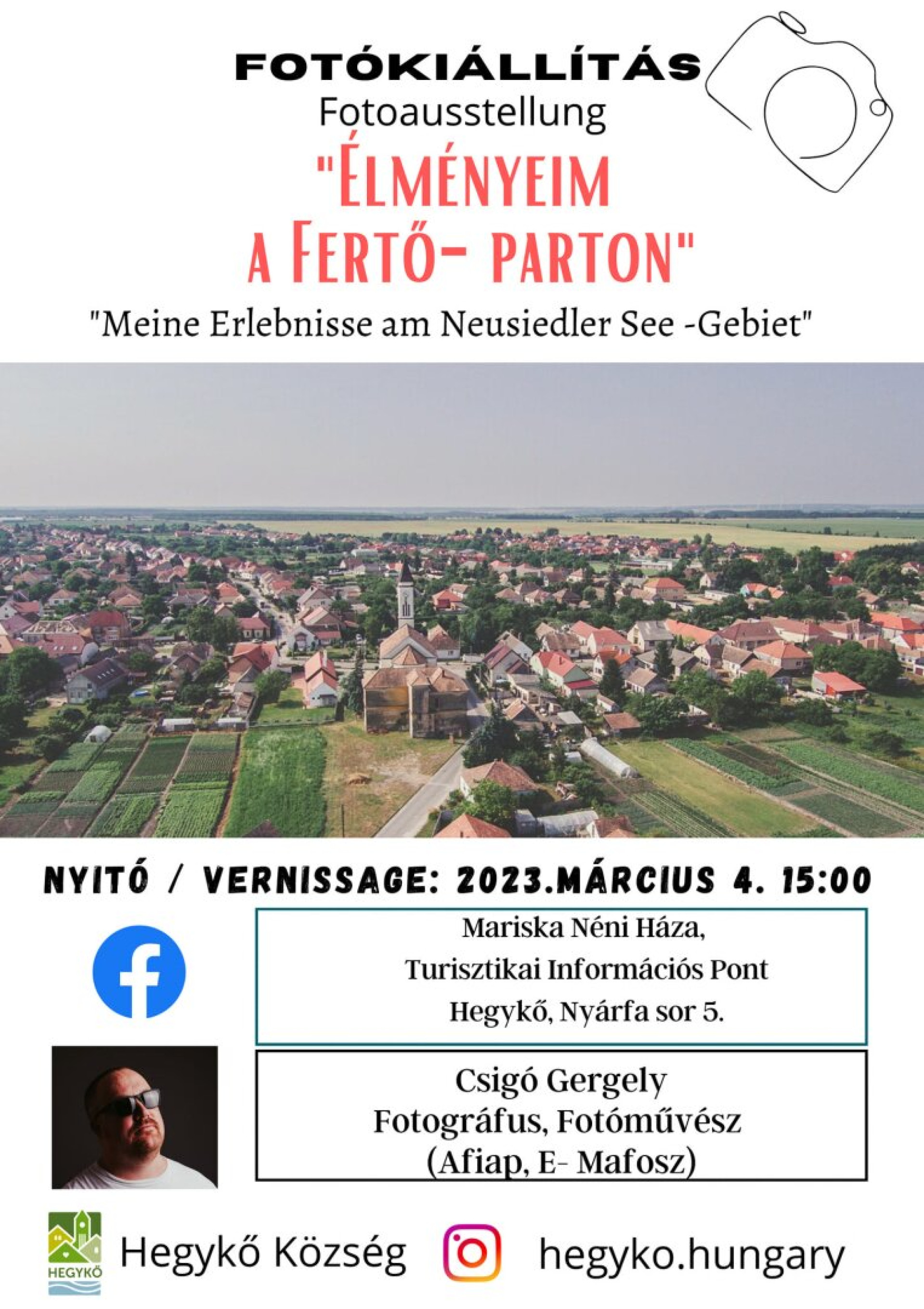 Ezeket a pillanatokat örökítette meg Csigó Gergely fotográfus, fotóművész (Afiap, Mafosz). Akinek neve teljesen összenőtt Hegykő Község nevével. Csigó Gergely "Geri" komolyan veszi munkáját, hobbiját, ami egyben szenvedélye! Aki már volt valaha Hegykő valamelyik rendezvényén biztos látta már a "vörös körszakállas fickót", aki mindenkit lencsevégre kapott. Igyekszik minden pillanatot megragadni, hogy azt át is adhassa!A fotográfus egyedi látásmódja és precíziója azonnal látható."Élményeim a Fertő-parton" cím is sugallja, hogy a Fertő-part habár néha felpörget, de mégis elandalít.... Prezentálva a Fertő-táj sokszínűségét, szépségét!