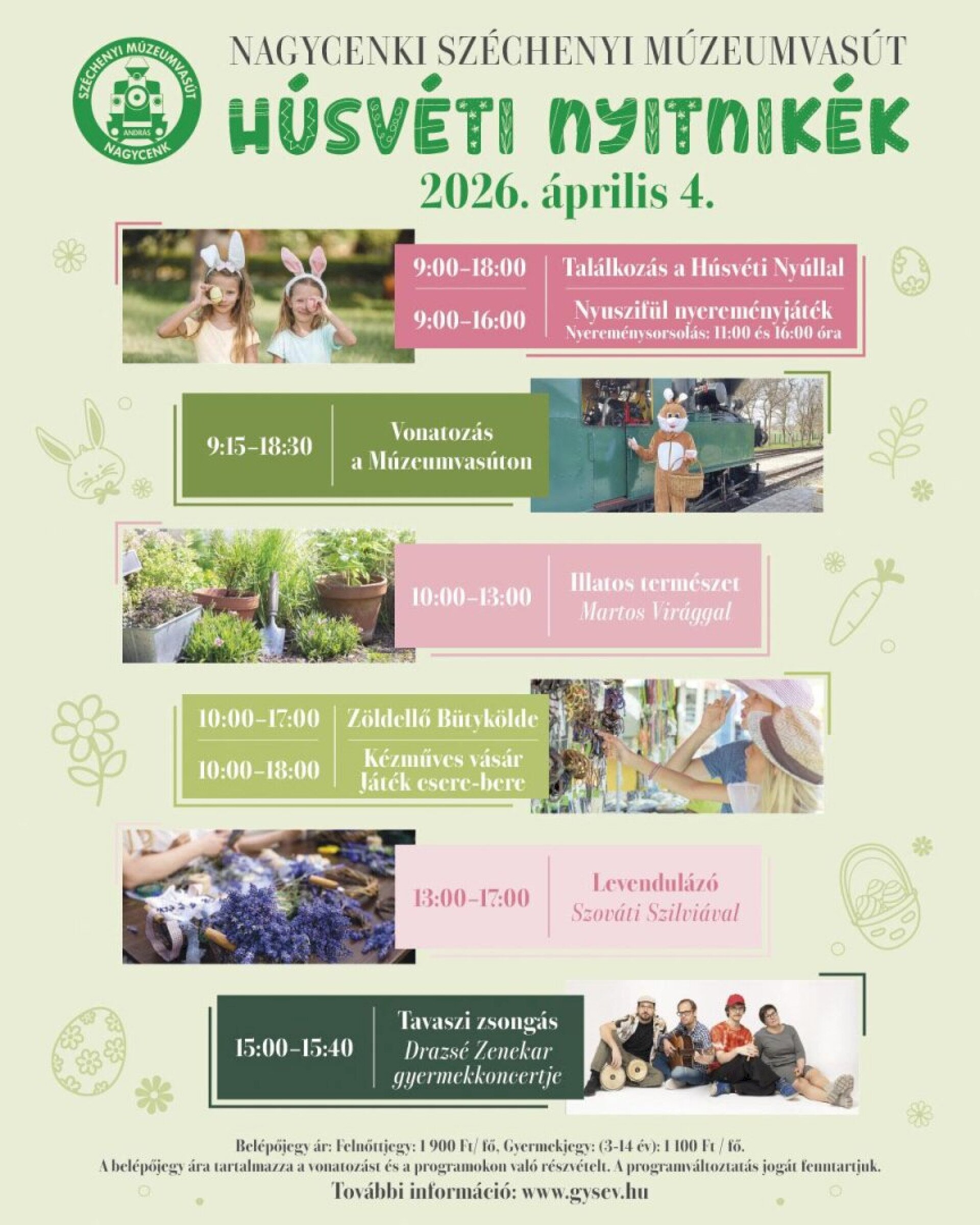 🚂 9:15-18:30: Vonatozás a Múzeumvasúton🌿10:00-13:00: Illatos természet – Martos Virággal: gyógy- és fűszernövények bemutatója, kóstolója, rajzolása, levendulás cukor és fűszersó készítés.✂️10:00-17:00: Zöldellő Bütykölde 🧺10:00-18:00: Kézműves vásár 🧸10:00-18:00: Játék csere-bere🪻13:00-17:00: Levendulázó – Szováti Szilviával: levendulával töltött húsvéti és tavaszi figurák készítése.🎸15:00-15:40: Tavaszi zsongás – Drazsé Zenekar gyermekkoncerje