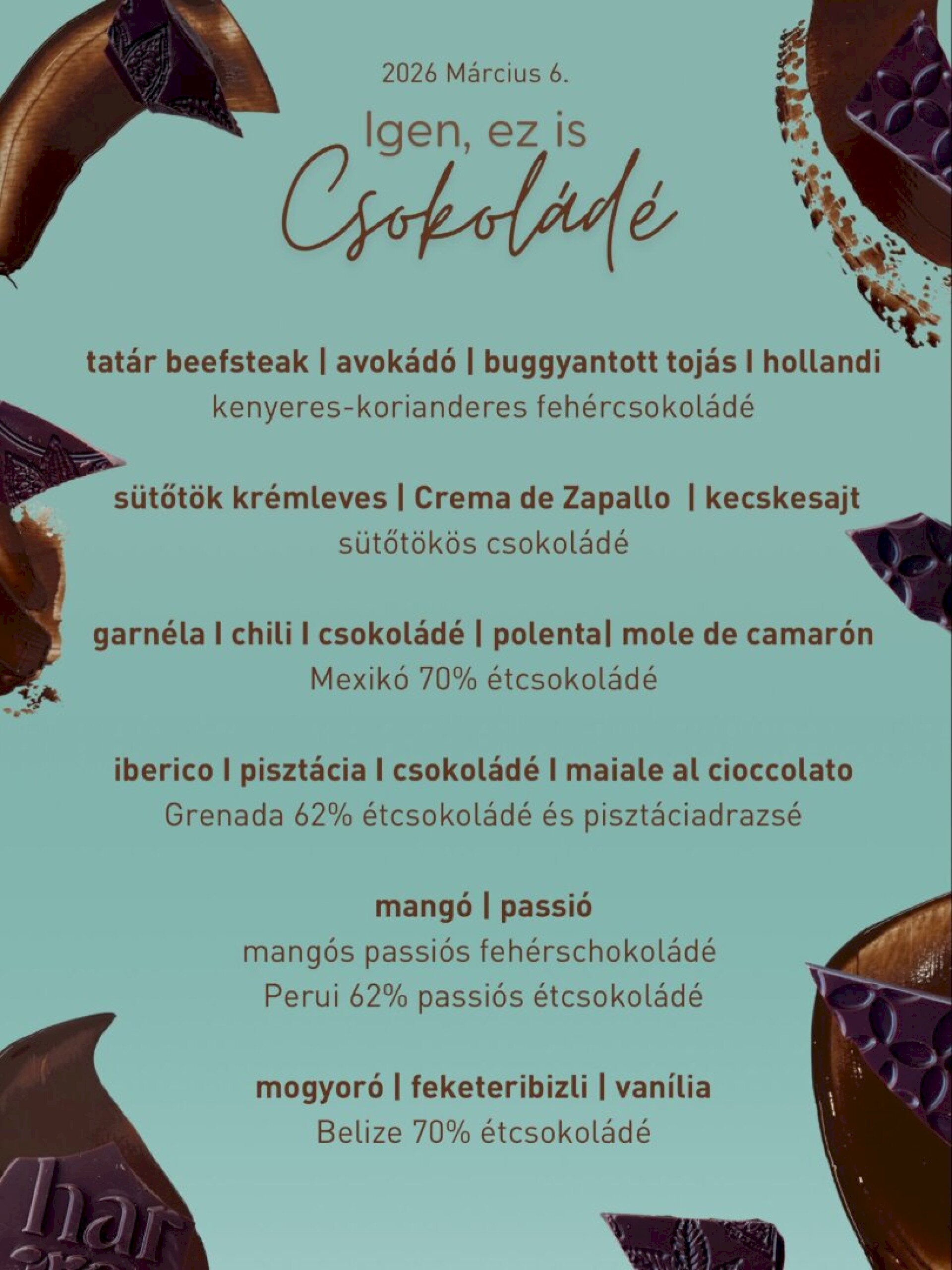Különleges 6 fogásos vacsora, ahol minden fogásba kerül KAKAÓ vagy CSOKOLÁDÉ! Zergével (Horváth László séf) és Karlival (Karl Harrer) 2026-ban is szeretnénk nektek megmutatni az általunk annyira szeretett kakaó, illetve csokoládé sokszínűségét és fantasztikus, végtelen felhasználási módját, egy kevésbé ismert módon.
