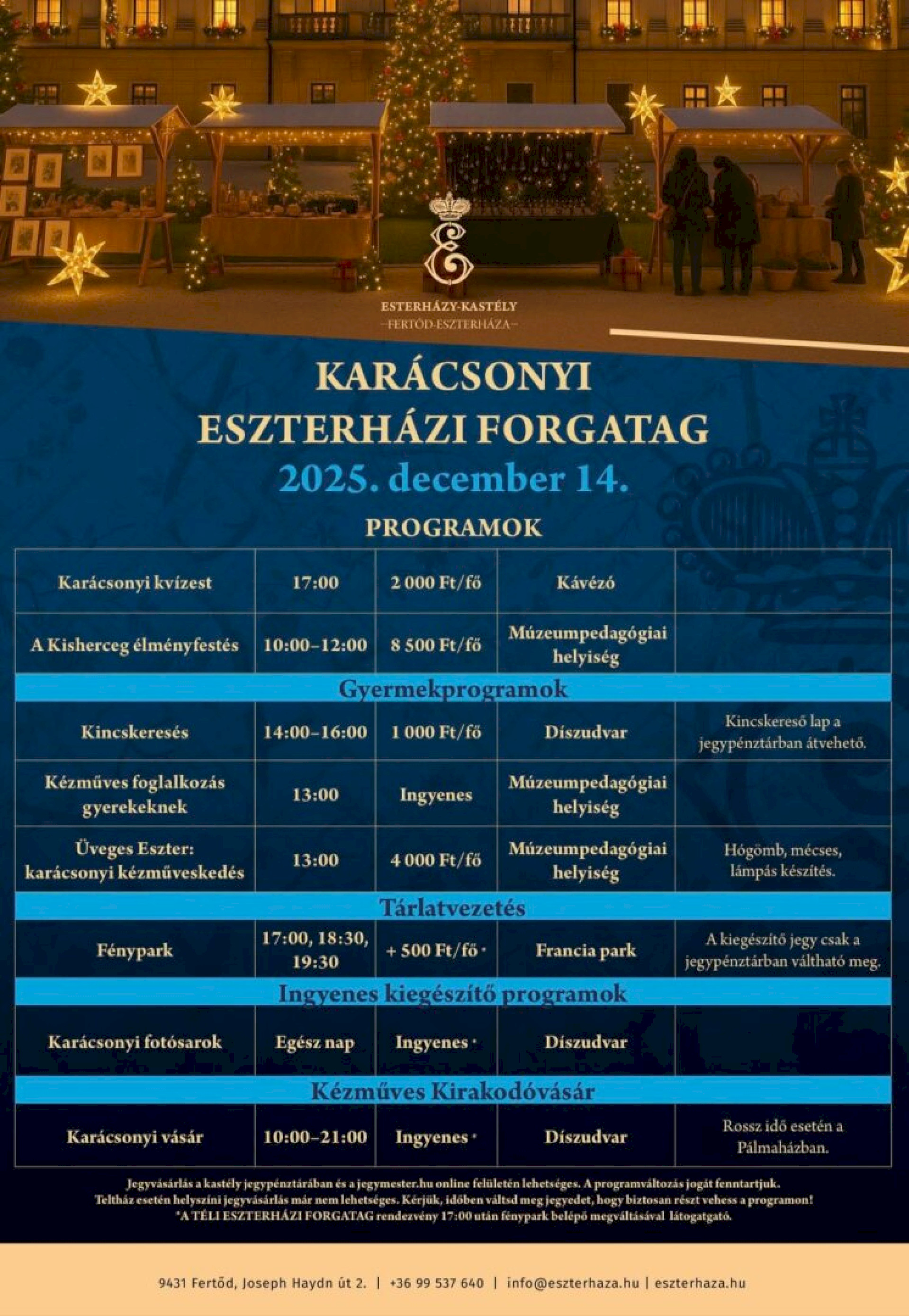 Varázslatos karácsonyi hangulat várja Önöket az Esterházy-kastélyban! Egész napos kézműves vásár, gyermekprogramok, élményfestés, kvízest és esti fénypark gondoskodik róla, hogy a család minden tagja felejthetetlen élményekkel gazdagodjon!