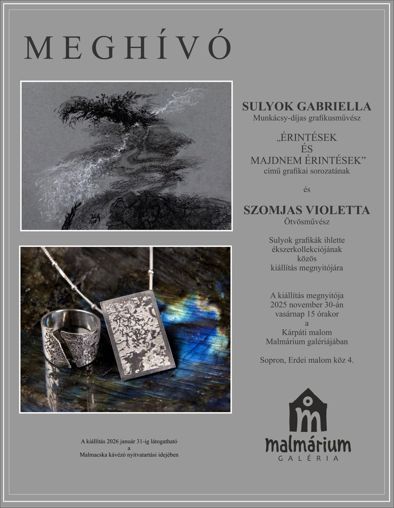 Elérhetőség Malmárium Galéria, Sopron Erdei malom köz 4.2025.11.30. 15:00+36 (30) 337 3589videograf@t-online.huGPS: 47.678337 / 16.540826WEBOLDAL