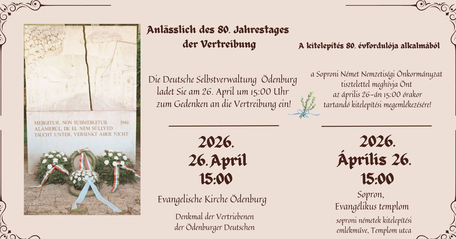 A Soproni Német Nemzetiségi Önkormányzat 2026 április 26-án 15:00 órakor tartja a kitelepítési megemlékezését.