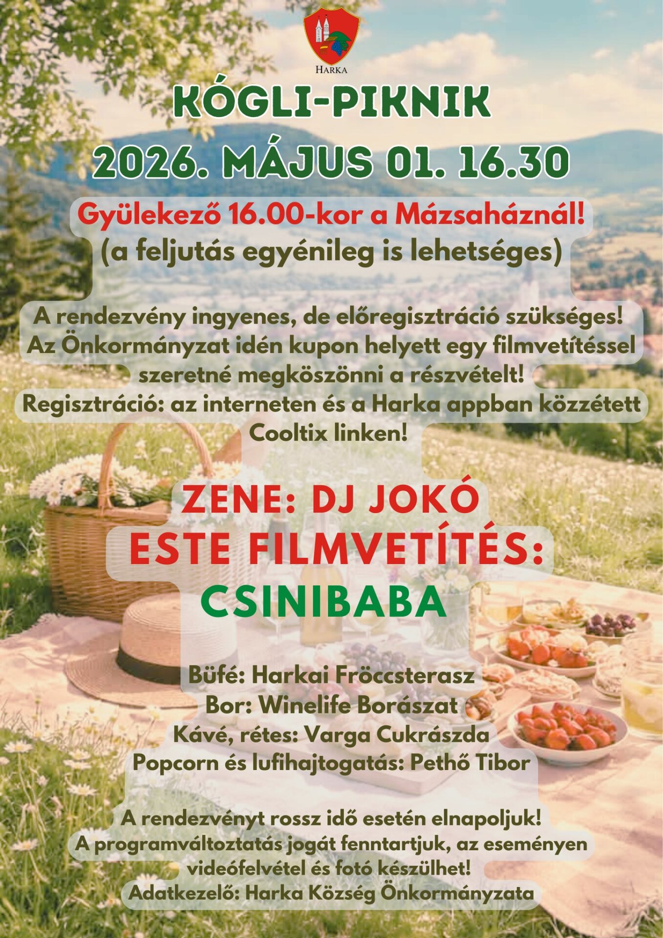 Dj Jokó szolgáltatja a háttérzenét, s amikor a Nap lenyugodni készül, filmvetítéssel zárjuk a napot! Tímár Péter 1995-ös remekművét, a Csinibabát nézzük meg együtt, 20:30 óra körül. A büfét a Harkai Fröccsterasz, a borokat a Winelife Borászat, kávét és rétest a harkai Varga Kávéház, lufihajtogatást és pattogatott kukoricát a filmhez Pethő Tibor Tibszi szolgáltatja!