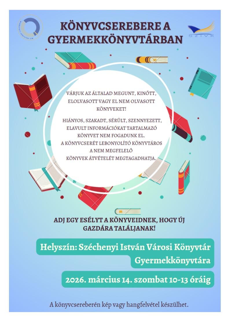 Elérhetőség Széchenyi István Városi Könyvtár, Sopron Pócsi utca 25.2026.03.14. 10:00+36 (99) 511 250szivkt@gmail.comGPS: 47.681910 / 16.597114WEBOLDAL