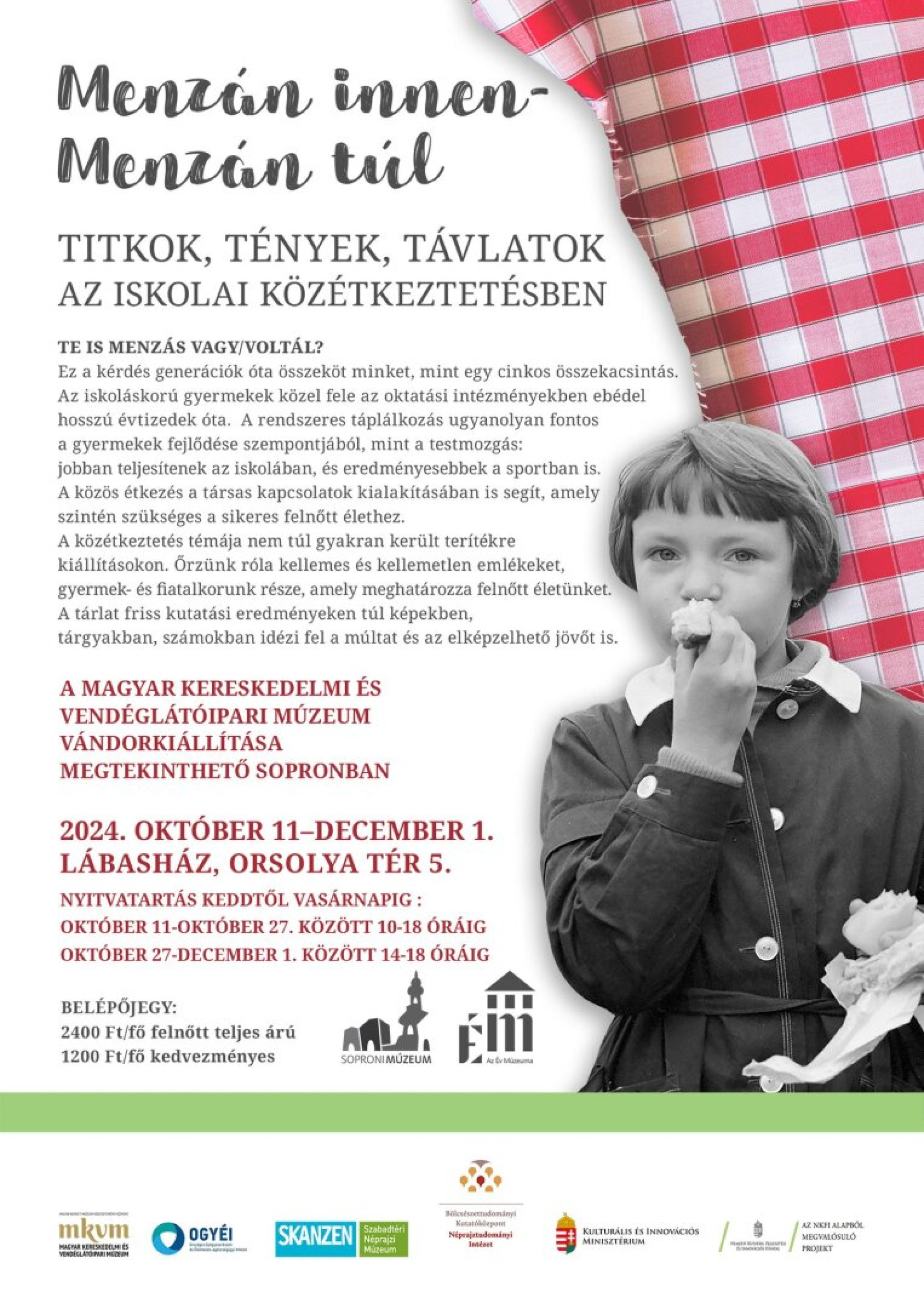 Különleges kiállítás érkezik Sopronba: 𝐌𝐞𝐧𝐳𝐚́𝐧 𝐢𝐧𝐧𝐞𝐧 – 𝐌𝐞𝐧𝐳𝐚́𝐧 𝐭𝐮́𝐥: 𝑡𝑖𝑡𝑘𝑜𝑘, 𝑡𝑒́𝑛𝑦𝑒𝑘, 𝑡𝑎́𝑣𝑙𝑎𝑡𝑜𝑘 𝑎𝑧 𝑖𝑠𝑘𝑜𝑙𝑎𝑖 𝑘𝑜̈𝑧𝑒́𝑡𝑘𝑒𝑧𝑡𝑒𝑡𝑒́𝑠𝑏𝑒𝑛 címmel. A vándorló tárlat az intézményi étkeztetés történetét mutatja be egészen a népkonyháktól napjainkig