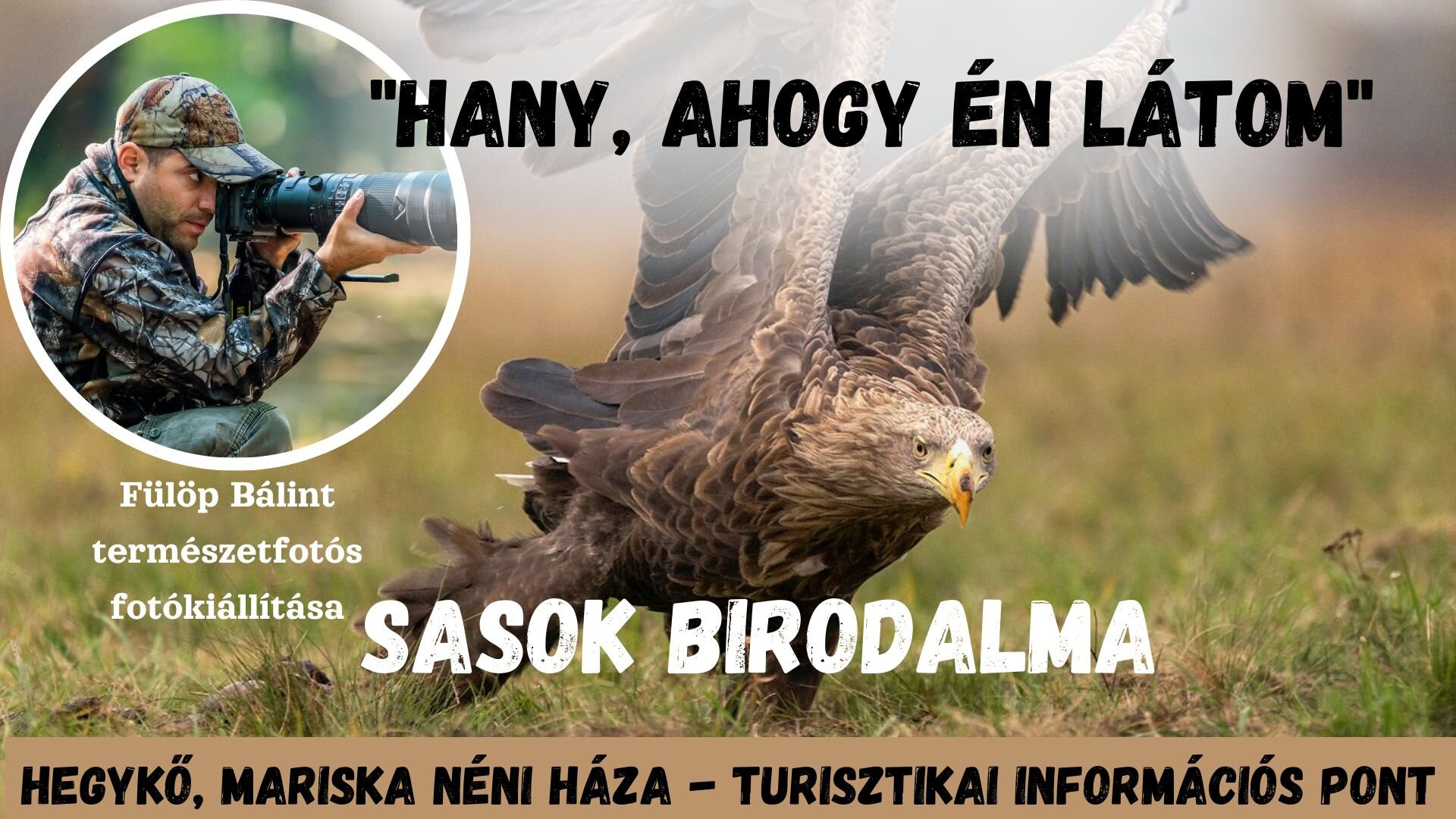 Fotóin keresztül betekintést nyerünk a hanyi rengeteg történéseibe. Mozgalmasak, élénkek! Ezúttal a kiállítás főszerepében a sasok vannak, de minden mást is megörökít Fülöp Bálint, - amely a Hanyban él és mozog!
