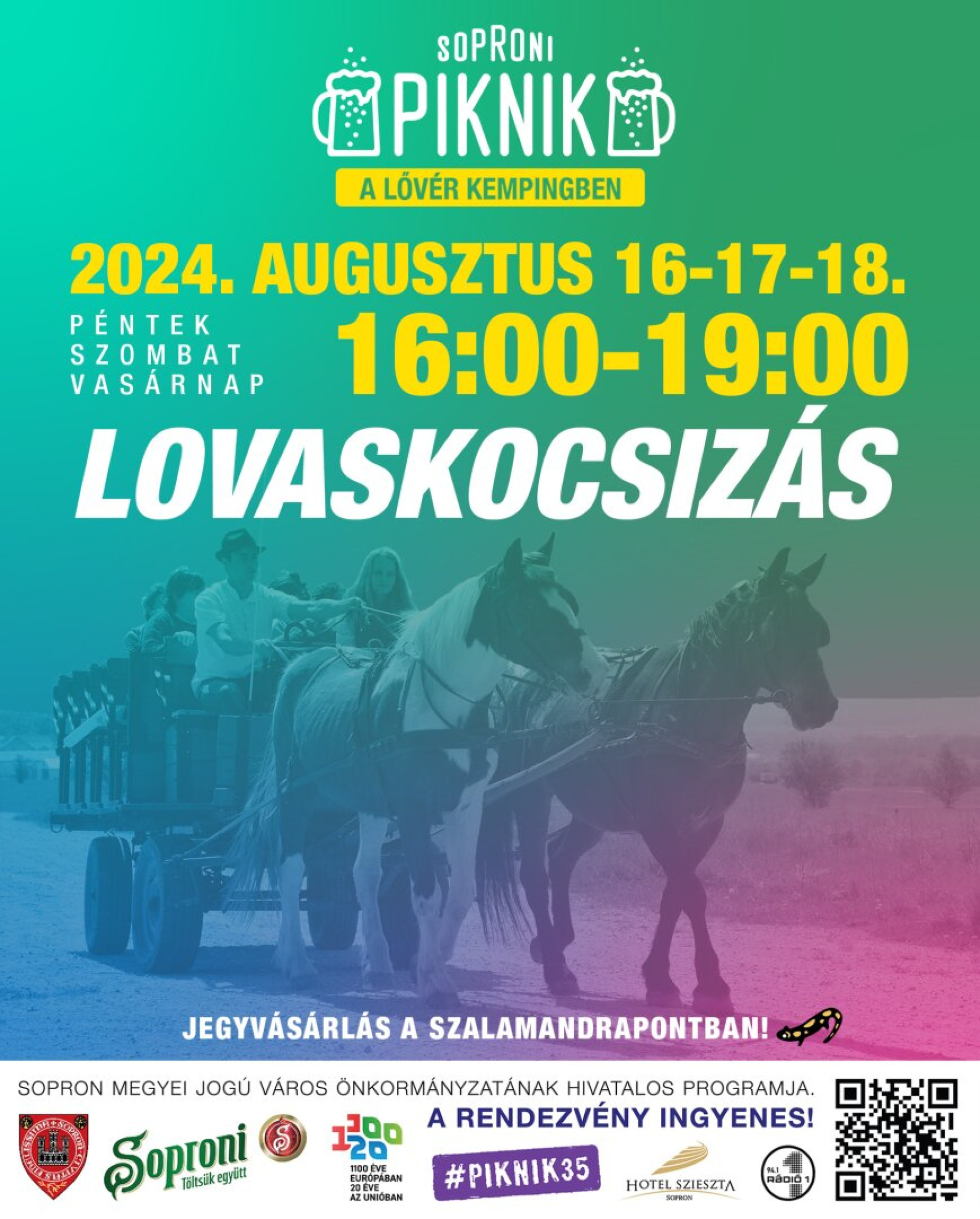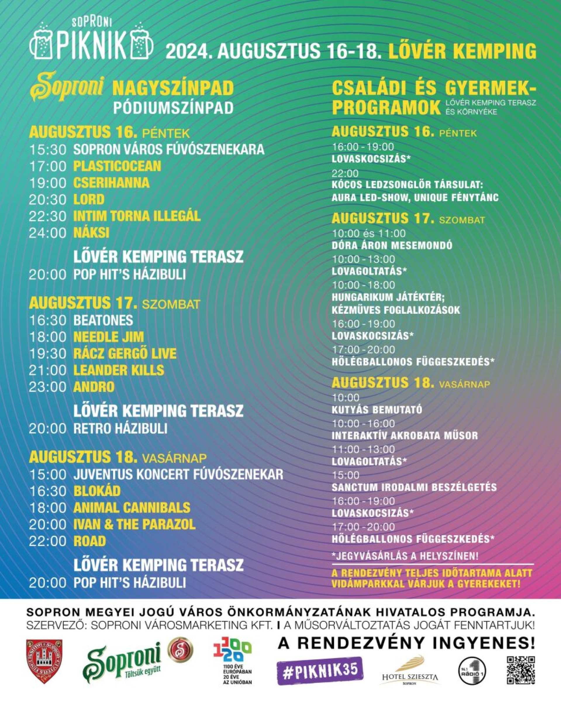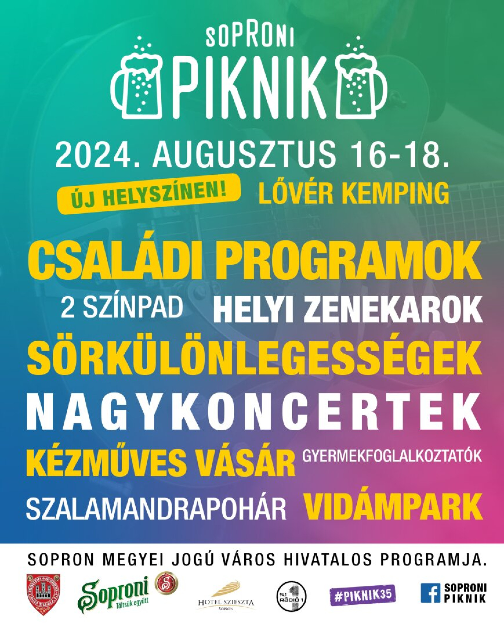 Új helyszínen a Soproni Piknik! Idén a Lővér Kempingbe invitálunk Benneteket, ahol könnyűzenei és családi programsorozattal várunk Sopron legzöldebb szegletében a Páneurópai Piknik 35. évfordulója, valamint az államalapítás ünnepe alkalmából.