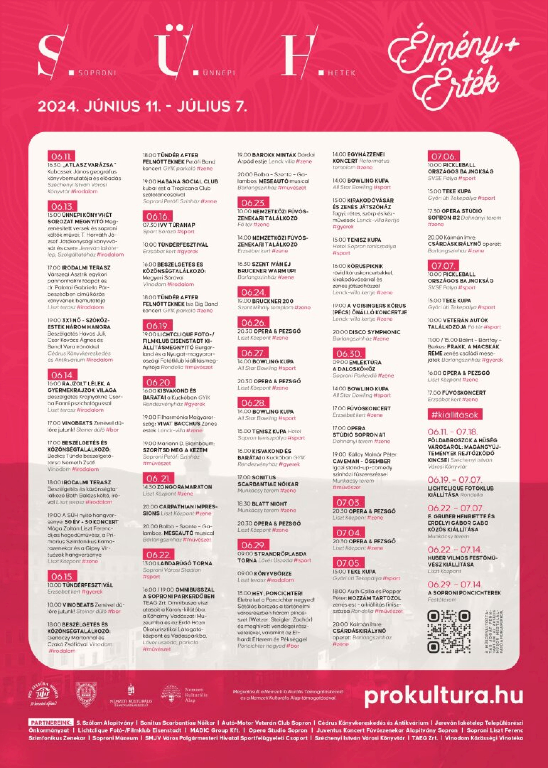 A hagyományokat megőrző, ugyanakkor a mai kor igényeinek és elvárásainak megfelelően megújuló, rendkívül igényes, magas színvonalú kulturális eseményeket kínáló, a nézői igények sokféleségét szem előtt tartó programsorozatot állítottunk ez évben össze, amelyet az előző évhez hasonlóan tematikusan állítottunk össze. 2024. június 11-től 2024. július 7-ig a minőségi szabadidős tevékenységé lesz a főszerep Sopron városában és a Fertőrákosi Barlangszínházban is.