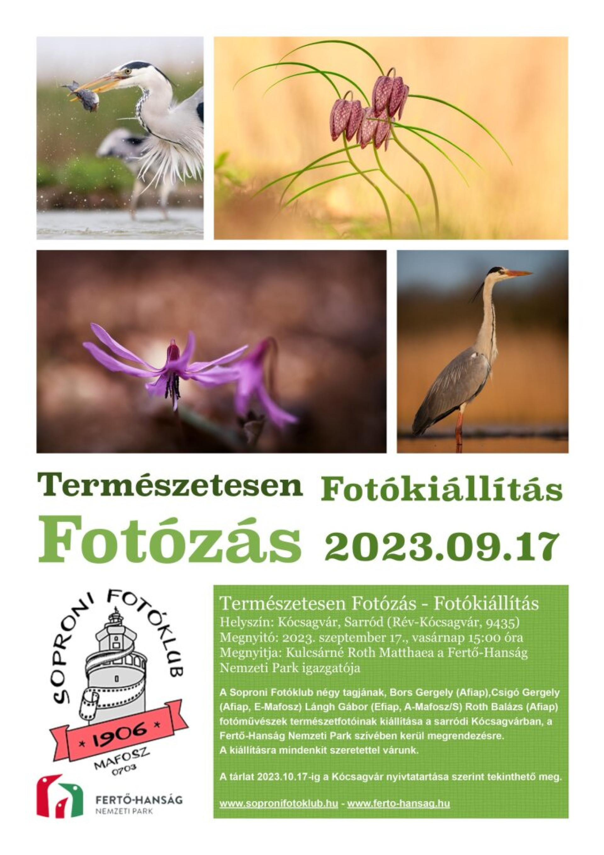 A Soproni Fotóklub négy tagjának, Bors Gergely (Afiap),Csigó Gergely (Afiap, E-Mafosz) Lángh Gábor (Efiap, A-Mafosz/S) Roth Balázs (Afiap) fotóművészek természetfotóinak kiállítása a sarródi Kócsagvárban, a Fertő-Hanság Nemzeti Park szívében kerül megrendezésre.