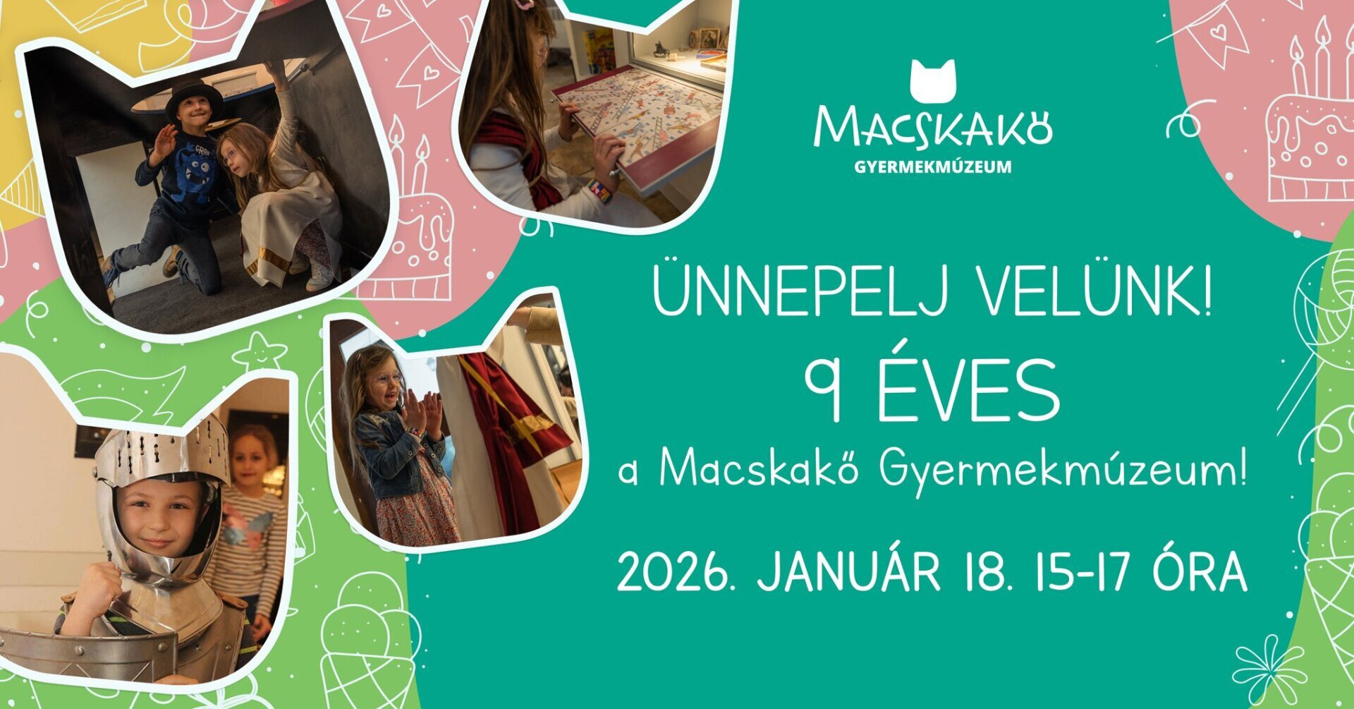 A Macskakő Gyermekmúzeum szülinapi tortáján 9 gyertyát gyújtunk meg január 18-án, vasárnap délután 15.00 órakor. Szeretnénk együtt tölteni ezt az ünnepet azokkal, akik megszerettek bennünket az eddig eltelt idő alatt!