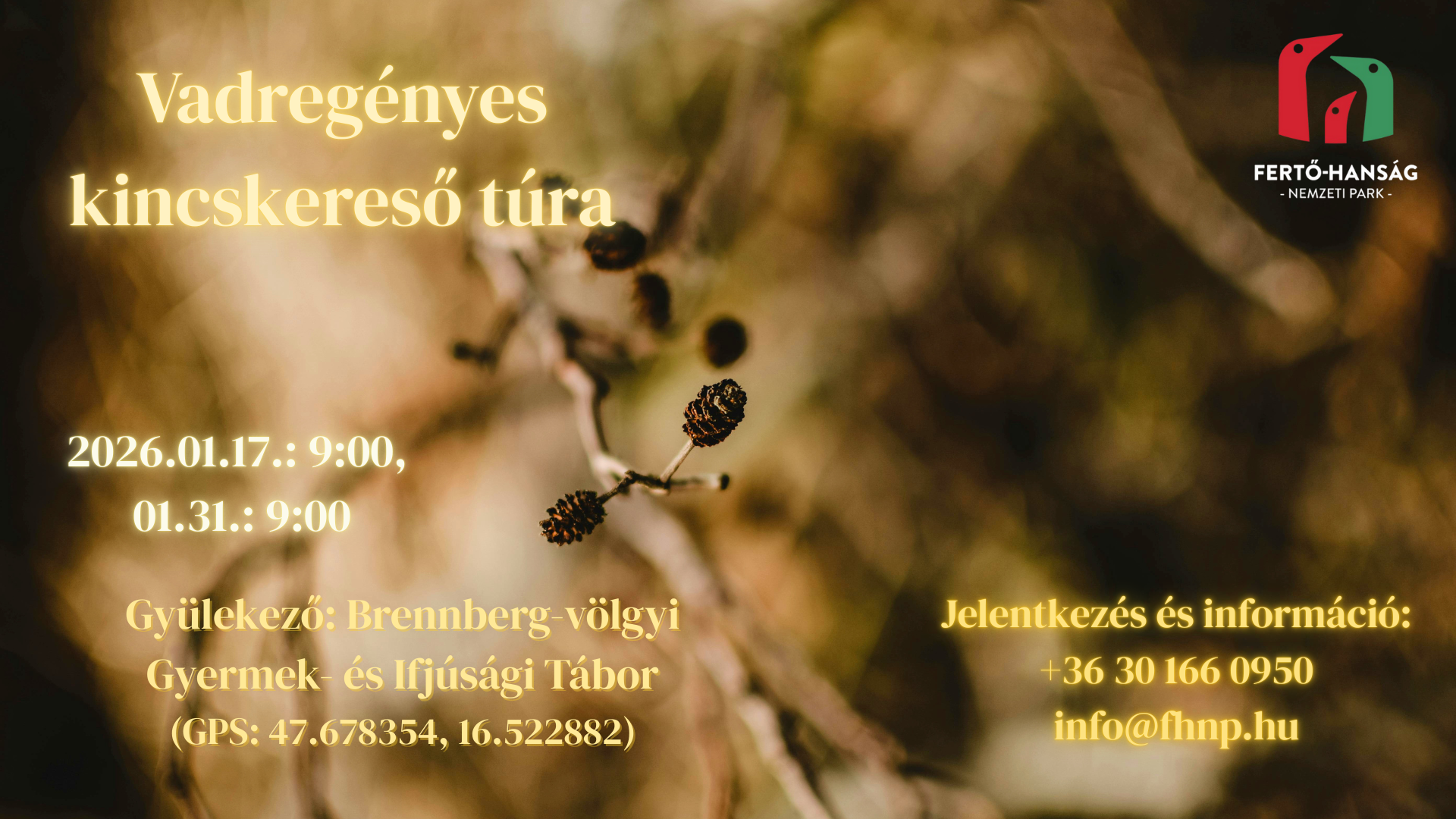 A téli erdő életét bemutató túrán Fertő-Hanság Nemzeti Park egyik legszebb területén barangolunk végig. A résztvevők kortól függetlenül izgalmas élménnyel gazdagodhatnak és számos érdekességet megtudhatnak az erdő fáinak életéről. Ezen kívül a kisebbek egy kis kincskereső játékban is részt vehetnek.