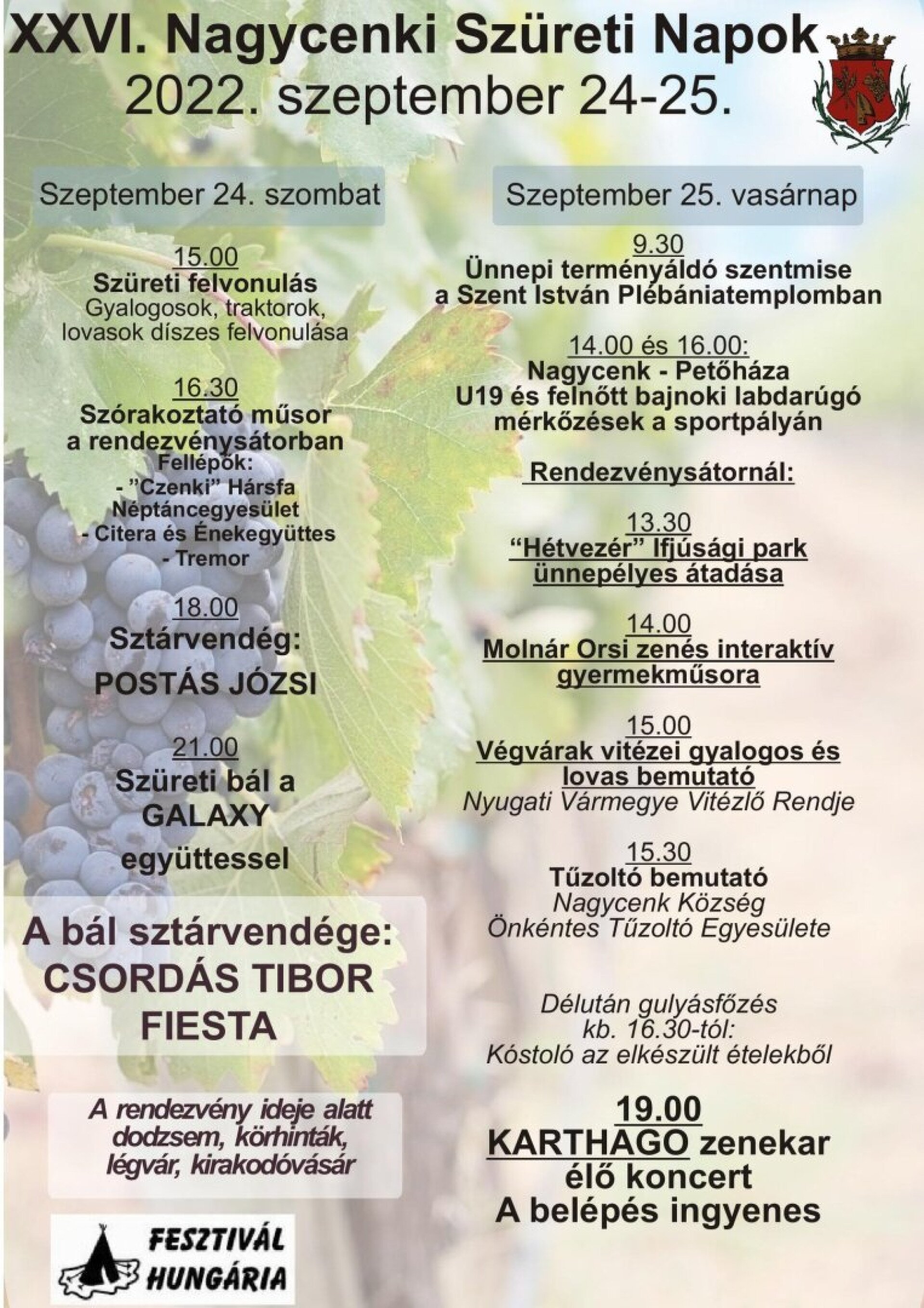A 26. alkalommal megrendezésre kerülő Nagycenki Szüret Napok az idei évben ismét változatos programot kínál. Részletes program a mellékelt plakáton.